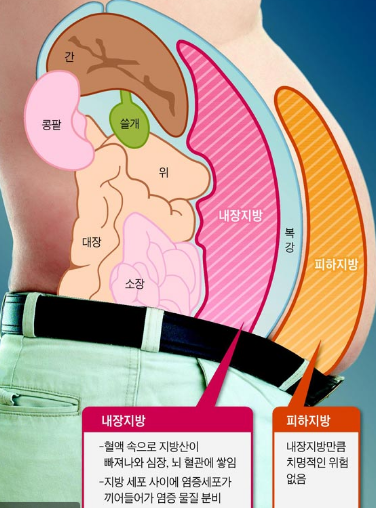 위에 나와있는것 같이 내장지방은 혈액 속으로 지방산이 나와서 심장, 뇌혈관 및 다른 많은 혈관에 쌓이게 되고,